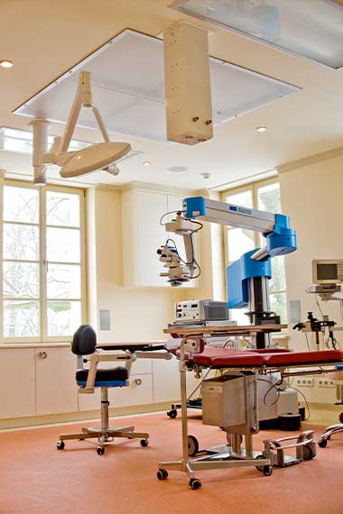Bei jeder Operation ist Hygiene das A und O. Bei einer Augenoperation steht anders als bei vielen anderen Operationen bei einer Wundinfektion nach einer Operation das Sehen komplett auf dem Spiel. Deswegen haben wir keine Kosten gescheut und unseren OP-Bereich weit über die für Augenoperationen geforderten Hygiene Richtlinien des Robert Koch Institutes ausgestattet. Freuen Sie sich über einen OP der Hygiene Klasse 1 mit Reinluftanlagen Laminar Flow – eine Investition in Ihre Sicherheit, um vor Komplikationen im Rahmen einer Operation durch den besten heute möglichen Stand der Hygiene-Technik zu schützen. Daneben werden Sie bei uns im OP nicht irgendwo in einem fensterlosen gefliesten Raum, sondern in der herrlichen ersten Etage mit schönen Wandanstrichen, schönem Licht und erhebendem Blick auf die russische Kolonie Alexandrowka behandelt.